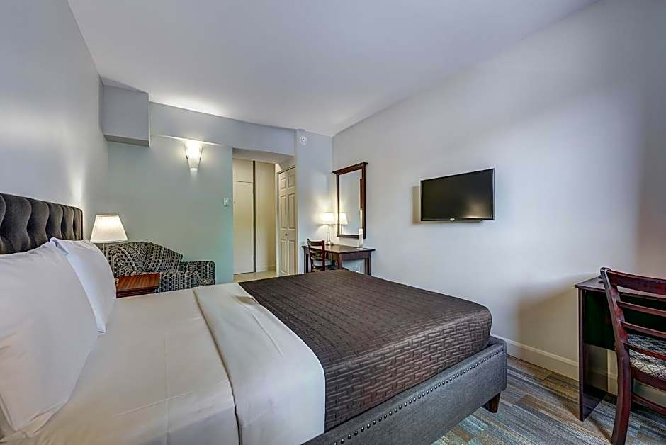 This studio features a small kitchenette and a living area with a sofa bed and cable TV. Bed type will vary based on availability upon check-in; guests will receive either a double, queen or king bed.