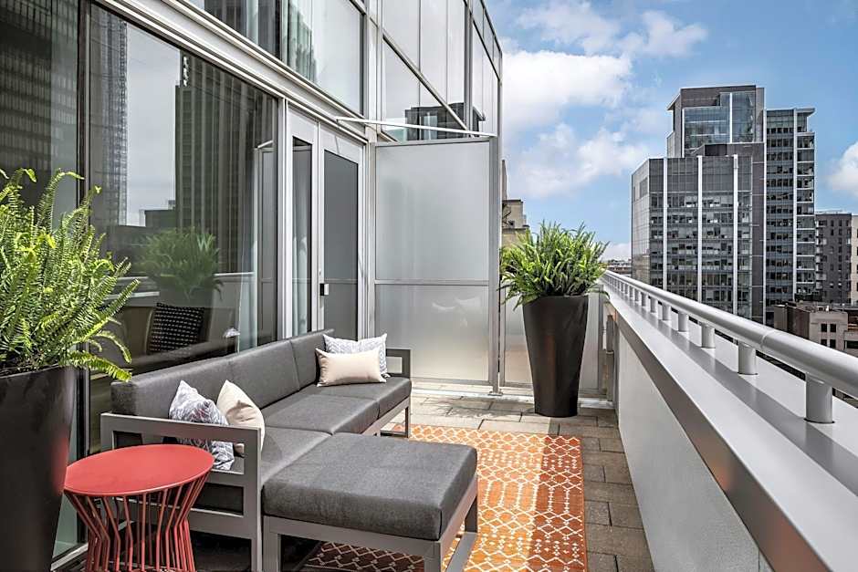 This suite features an outdoor terrace overlooking Square Victoria Park, a full-size dining room, and a separate living room.
