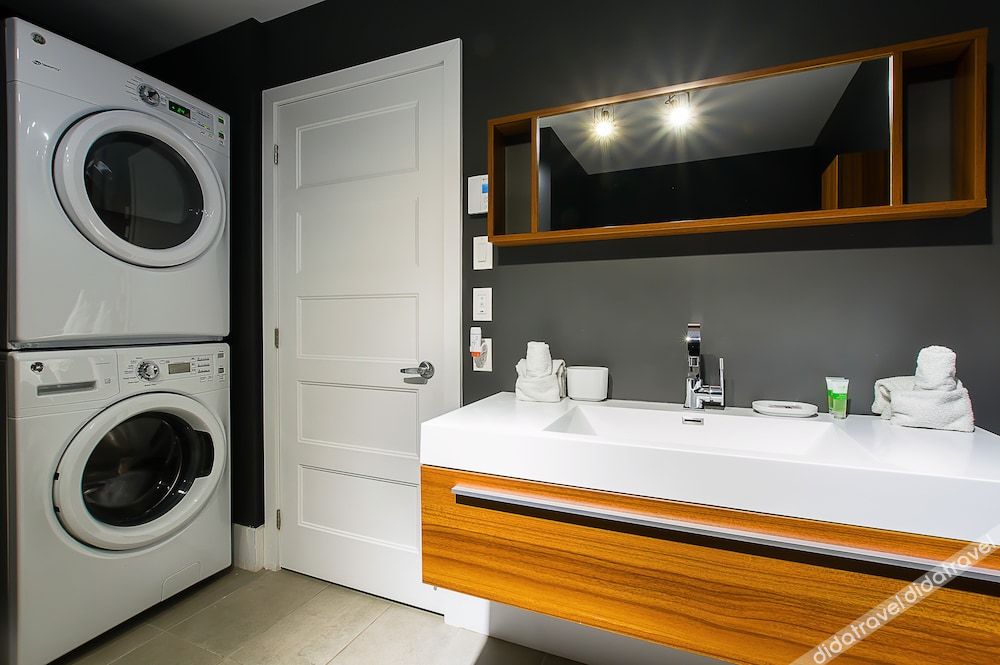The interior of the condo was clean, spacious, with good cooking, relaxing and sleeping arrangements. The funkiness of the interior was a big hit with everyone in our party of four. The beds were comfy, and having a full kitchen was fantastic. The bathroom, an important consideration for any stay, was modern, clean, and very functional. The walk to old Quebec was easy and enjoyable. The building was secure. A parking garage was a short walk away and the all day parking was inexpensive. All in all a great place to stay.