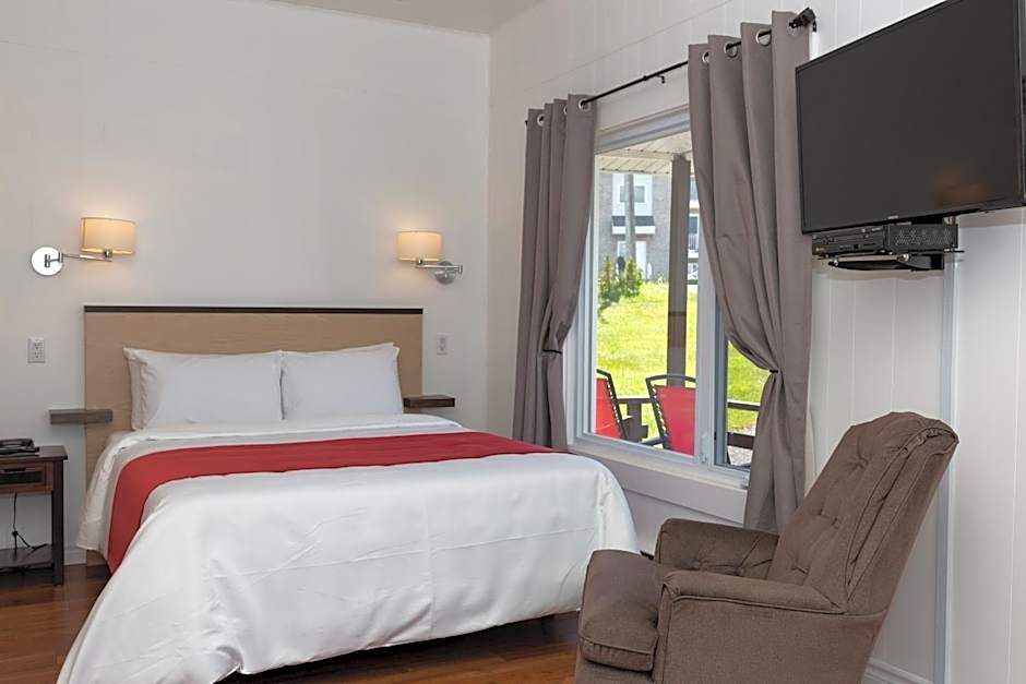 Probably the best part is the view! You can sit on your balcony or terrace and watch the sun set. There is a whole outdoor area with swings and chairs that you can enjoy the view from as well. There is even an outdoor fire pit. The location is a short drive from the river where you can take a stroll on a beach. It is also a short drive from the waterfall park. We stopped here on the way to and from Gaspese. On the way there we stayed in one of the cottages which was equipped with a kitchenette that had a stove, microwave, fridge and a small sink, as well as some dishes. On the way back we stayed in the hotel room which had a microwave and fridge only. Both very good. I would recommend the cottage if you plan to stay multiple nights and plan on cooking. The staff at the check in was very nice as well 😃