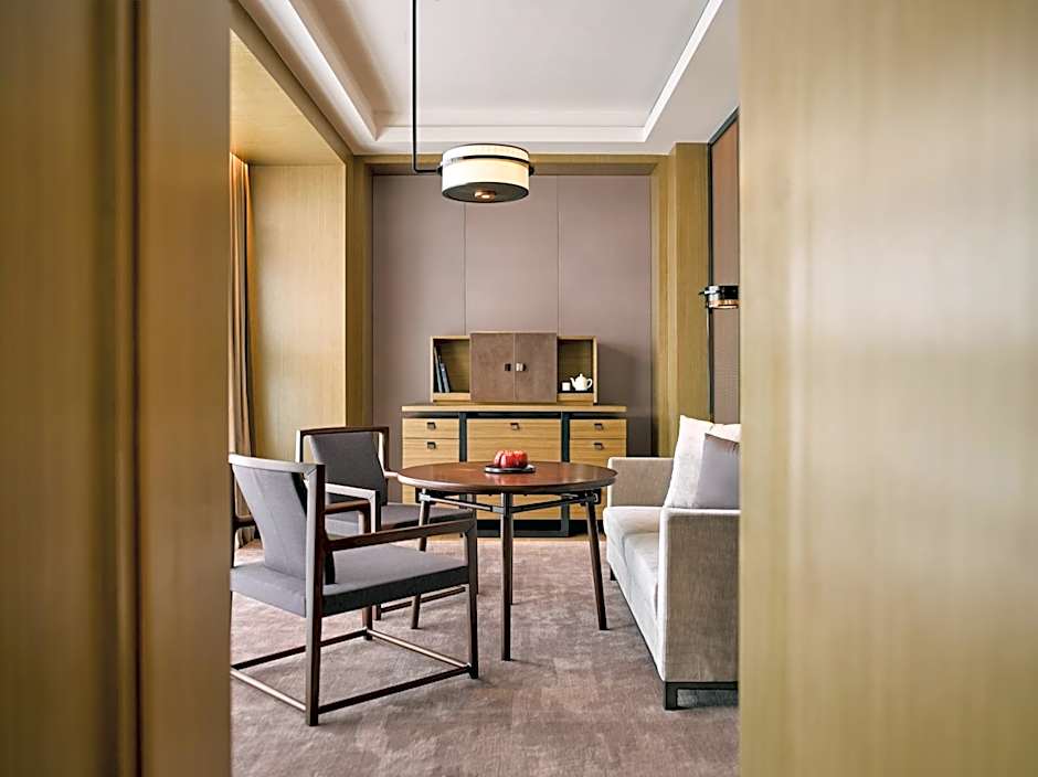 The 150 sqm PuXuan Suite offers the hotel’s most prominent views across the Forbidden City. A study room and designated tea preparation area complement the living space.