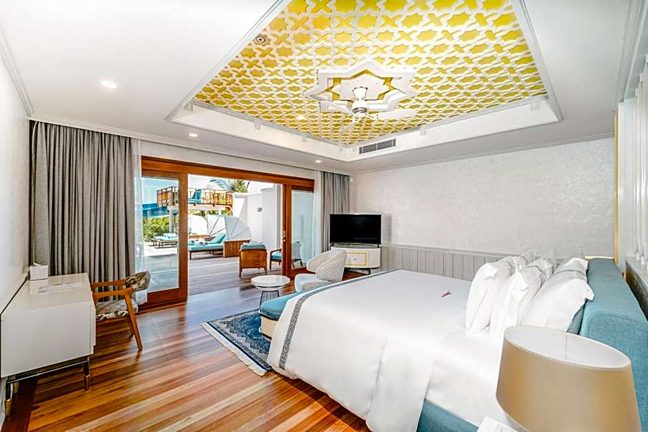 Rooms come in a varied lineup, suited for different needs. The Executive, Queen room accommodates two adults and features a 1 Queen size bed. The Queen Room also offers a 1 Queen size bed for two, while the Twin Room includes a 1 Twin bed for comfortable twin-sharing. The Residence, Beach View accommodates two adults and one child, with a flexible setup. Other options include Deluxe Double Room and Family, providing additional choices for different stays.