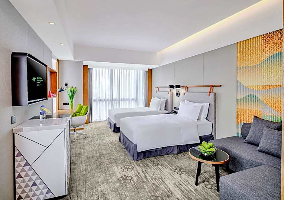 The Holiday Inn Guangzhou South Lake offers a variety of rooms including suites, triple rooms, twin rooms, and double rooms. Smoking is not allowed in any of the rooms. The rooms can accommodate 2 adults and 1-2 children, depending on the room type. Bed sizes range from King size to Twin beds, and room sizes are 398 sqft or 592 sqft for the suites.