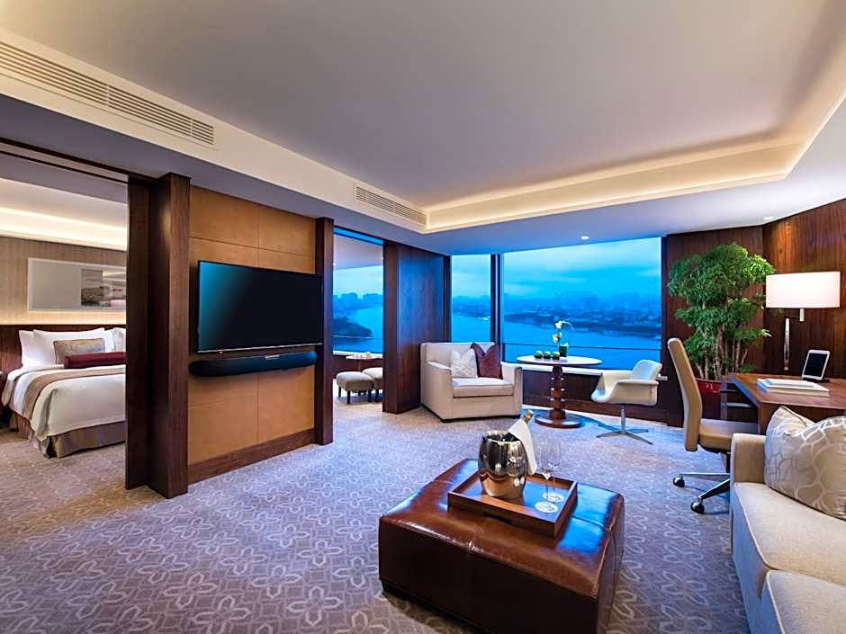 Room offers floor-to-ceiling windows with views of the Pearl River. The private marble bathroom offers a spa-like deep soaking bathtub and separate rainshower.