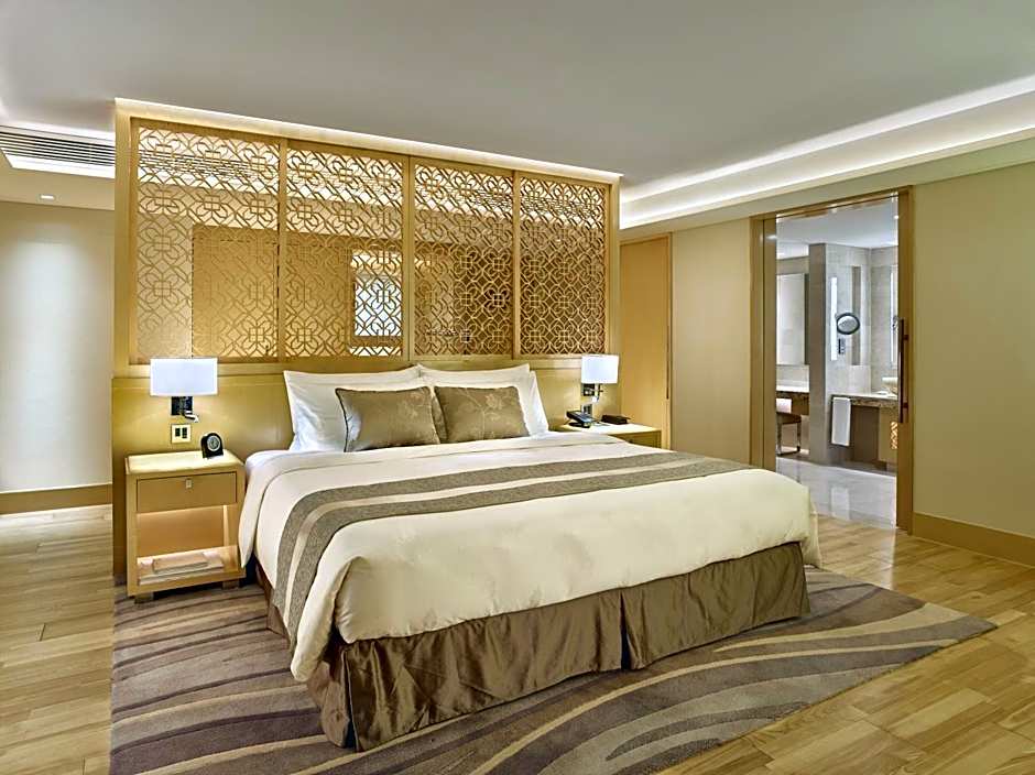 Room offers floor-to-ceiling windows and views of Guangzhou skyline. The private marble bathroom offers a separate bathtub and rainshower.