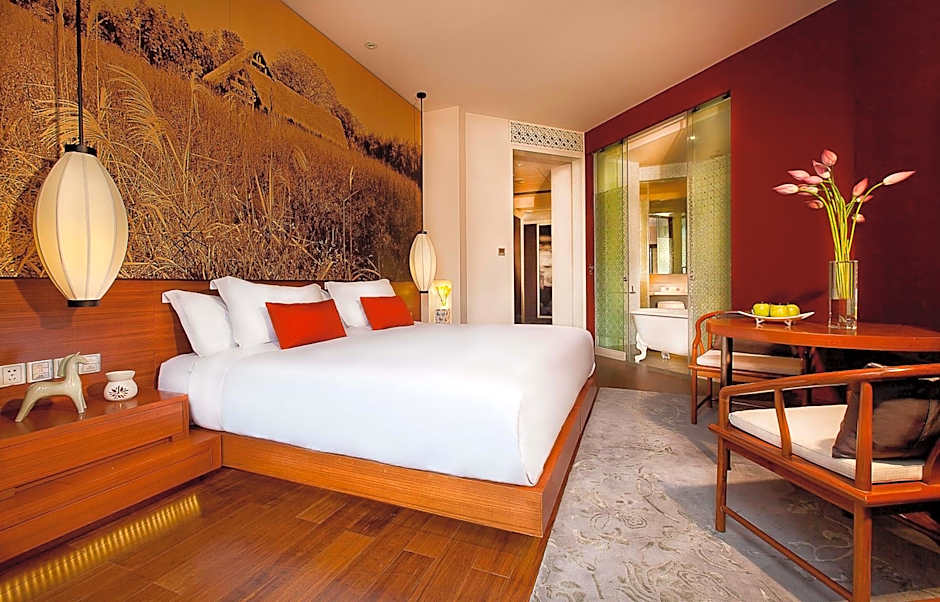 The guest room is decorated in neo-Chinese style and features a comfortable king bed. Sit on your balcony and enjoy the natural wetland views.