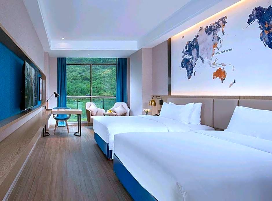 Room choices are diverse, with sizes ranging from 302 to 453 square feet. Options include Premier (302 sqft), Premium (323 sqft), Room - 1 Twin (453 sqft), and Room - Twin (323 sqft), as well as Youxiang Business King View, Elegant Business Twin with Mountain View, King Room, Sky View, and several suites. The lineup suits couples, business travelers, and small groups seeking comfortable stays near the Wanda Plaza and city center.