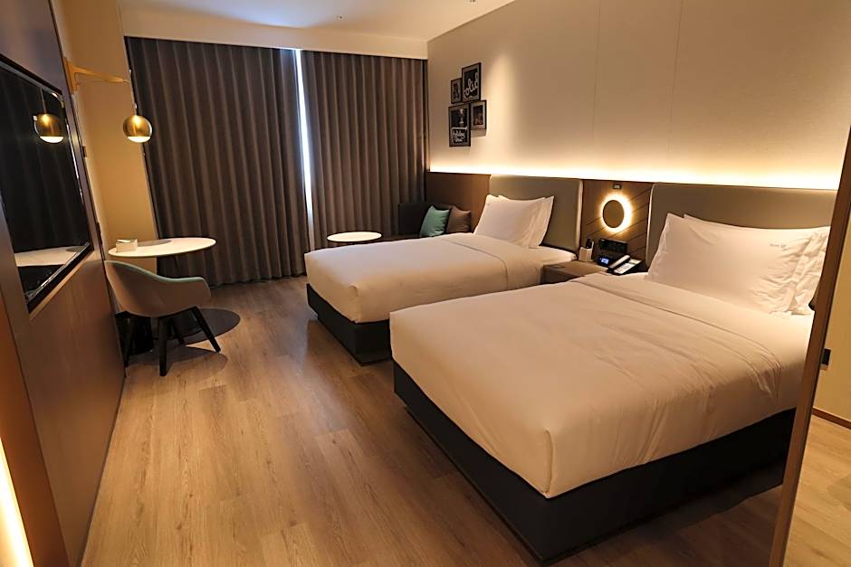 Overall, a nice hotel with a modern interior, very, very clean, and excellent service (including English-speaking staff). Fresh water was delivered to the room every day. We arrived earlier than expected, but the room was already available, and we were able to check in immediately without any hassle. Breakfast was exceptional, offering a wide variety of both Chinese and European cuisine. There were plenty of options, and the food was very tasty and of high quality. Many dishes were freshly prepared in front of you (I never got bored with the fresh omelettes). There was also an abundance of vegetables and fruits—the watermelon was a daily must-have for the children. The pictures provided were truly representative, and there were no unpleasant surprises upon arrival. The rooms are spacious; we stayed in a standard room with two adults and two children, and it was comfortable. A couple staying in the same room would have plenty of space. The bathroom setup was particularly nice, with a separate toilet and a very large shower. I especially liked how the shower floor was designed—every hotel should adopt this feature. The location is within walking distance of the metro and railway station, yet you don’t feel like you’re near a station. There was absolutely no noise from the surroundings. According to other guests’ demography, this is a truly family- and children-friendly hotel.