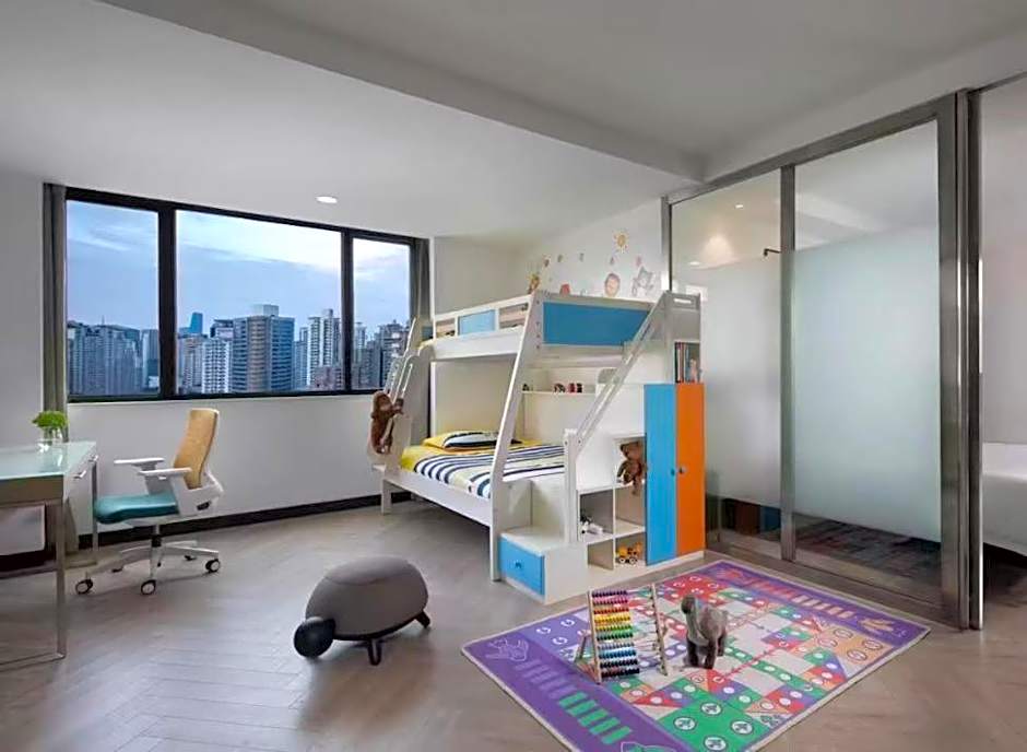 Holiday Inn Shanghai Vista offers a variety of rooms including Premium Kids Theme, Premium Lounge Access, Standard, and Suites. Room sizes range from 355 to 646 sqft. Smoking is not allowed in any room. Beds include King size, Double, Twin, and Bunk beds. Occupancy accommodates between 2 to 4 adults and 1 to 3 children in different room types.
