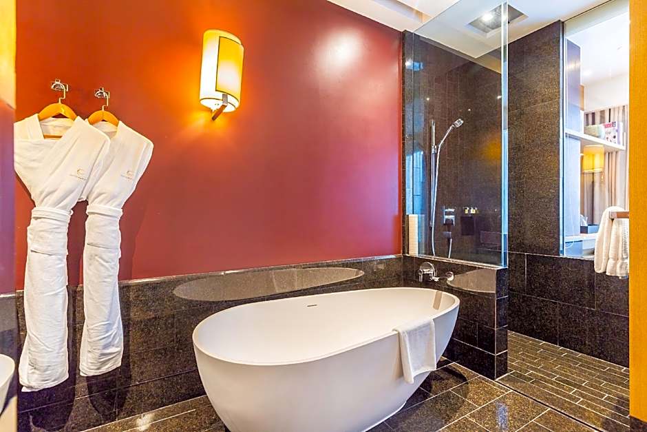 Guests will have a special experience as the double room features a hot tub. Providing free toiletries and bathrobes, this double room includes a private bathroom with a bath, a hairdryer and slippers. The spacious air-conditioned double room provides a flat-screen TV with cable channels, soundproof walls, a mini-bar, a seating area as well as city views. The unit offers 1 bed.
