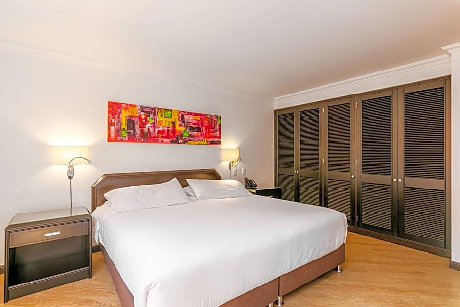 The suite features a living room area, a King size bed and views of the hills surrounding Bogota. It is equipped with a work desk and a fireplace.
