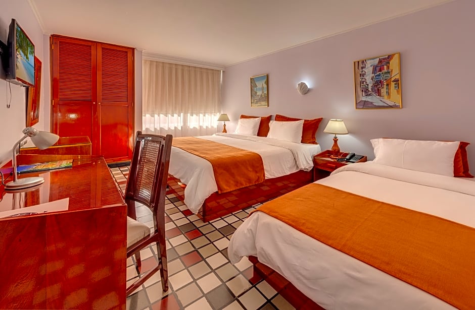 Sunrise swims and lazy days by the sun deck set the tone in this three-star Cartagena retreat tucked into Bocagrande. Two outdoor pools invite a refreshing dip, including a dedicated kids’ pool with a shallow end for the little guests. Beach chairs and loungers line the grounds, while balconies offer a private perch to take in the surrounding landmark view.