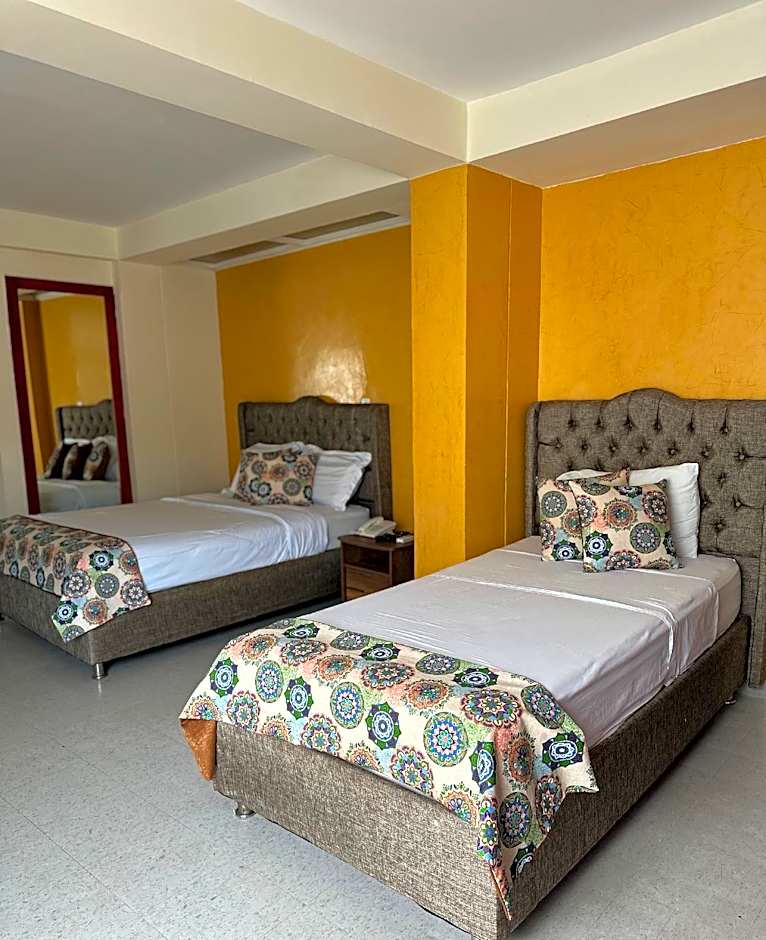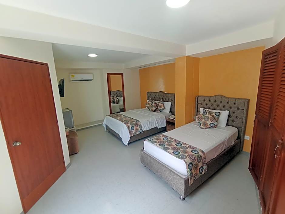 The LuKa Cartagena Hotel offers Deluxe Triple Rooms that can accommodate 3 adults and have a room size of 108 sqft. Smoking is not allowed in these rooms. They are equipped with 1 Twin bed and 1 Queen size bed.