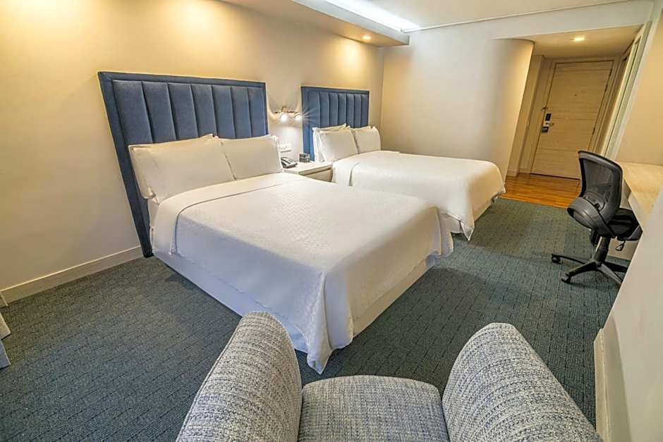 The hotel offers a Double Room with Two Double Beds, accommodating 2 adults and 1 child, with 2 Queen size beds and a size of 312 sqft. Smoking is not allowed in this room. Another option is the Superior King Room, accommodating 2 adults and 1 child, with a King size bed and a Sofa Bed. This room is 344 sqft and also does not allow smoking.