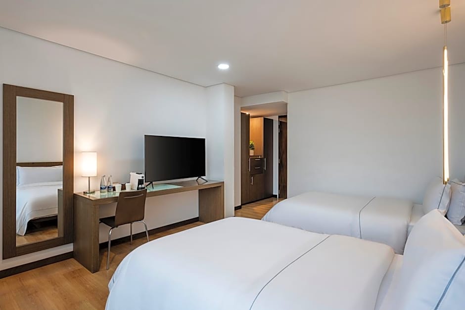 Hotel Poblado Alejandria offers a Junior Suite, Double Room, and Twin Room. The Junior Suite is the largest, measuring 646 sqft, while the Double Room and Twin Room are both 291 sqft. Smoking is not allowed in any of the rooms. Each room can accommodate 2 adults and 1 child, with the Junior Suite having a Queen size bed and the Double Room and Twin Room having either a Queen size bed or 2 Twin beds.