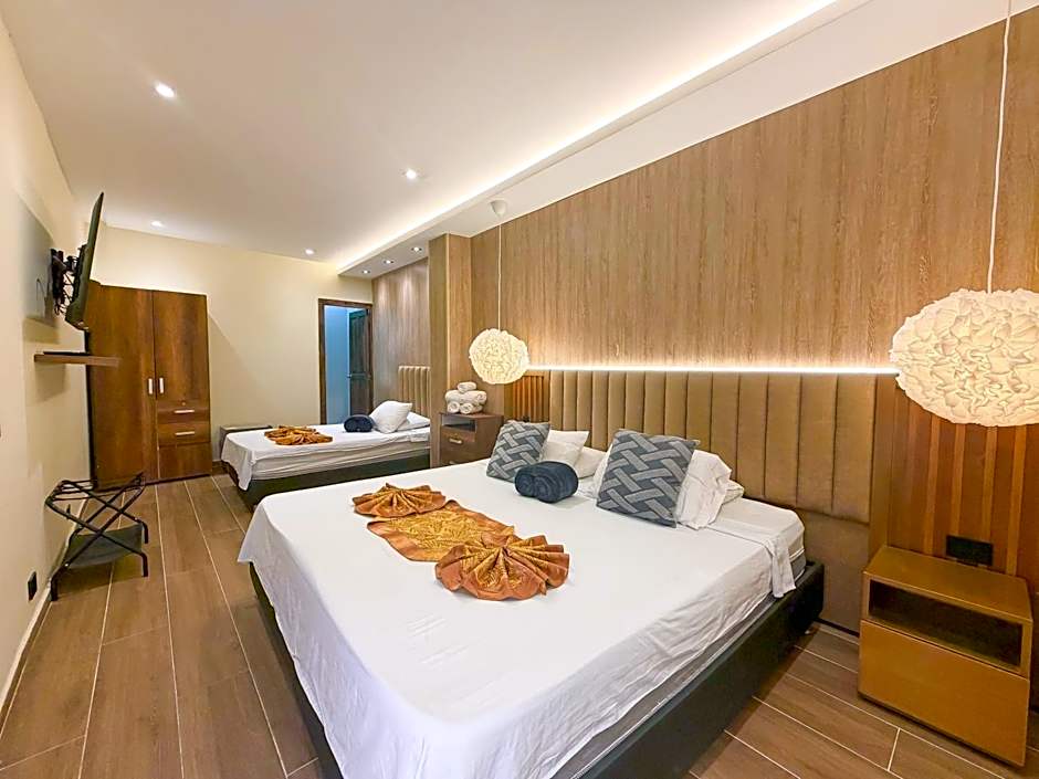 The hotel offers various types of rooms, including Quadruple, Triple, and Double rooms. The Quadruple rooms have a size range of 431 to 538 sqft and accommodate 4 adults, while the Triple rooms have a size of 409 sqft and accommodate 3 adults. The Double rooms have a size of 323 sqft and accommodate 2 adults. Smoking is not allowed in any of the rooms. The beds in the rooms include a combination of King, Double, and Twin beds.