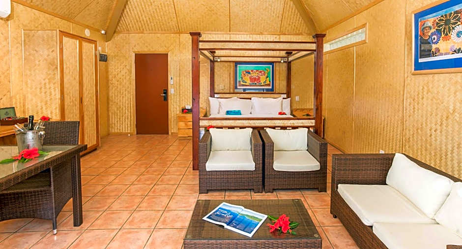 Beachside Suites are located directly on the white sands of Aroa Beach with partial lagoon views and direct access to the Aroa Lagoon. They boast a tiled bathroom with black pearl accents, a spacious curved glass shower and rain-tree vanity top with designer porcelain basin, rattan-lined walls, hand crafted lighting and artwork, rattan furniture, tropical kauri wardrobe, sofa and an indoor-outdoor flow through wide-opening sliding doors. These stylish absolute-beachfront Suite's offer snorkeling in Aroa Lagoon Marine Sanctuary at your door.