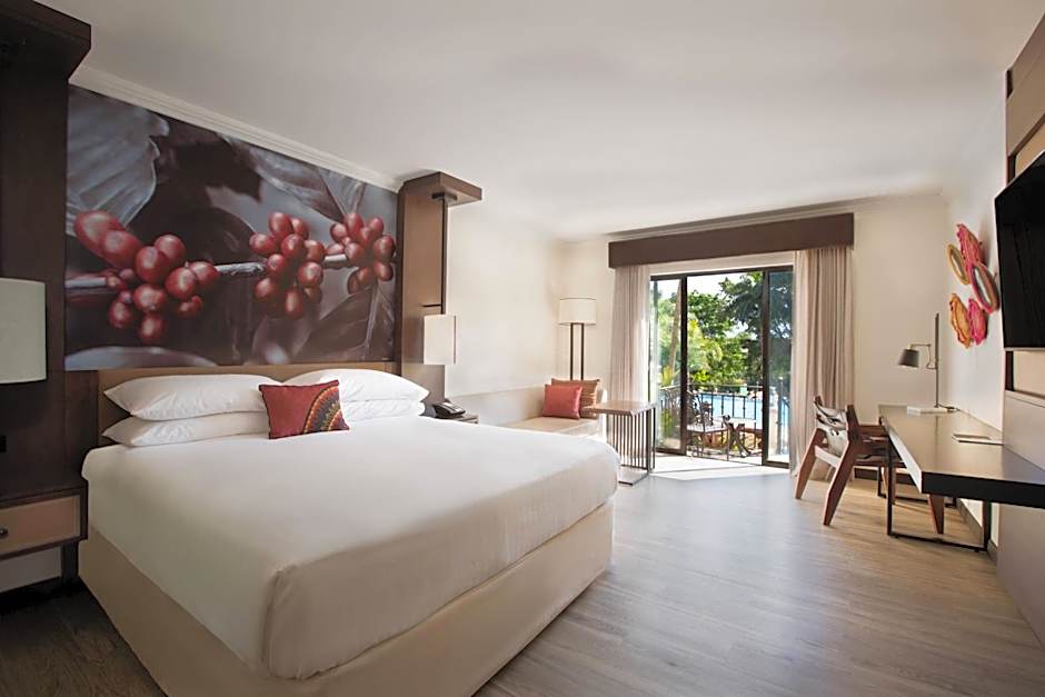 Guests at Costa Rica Marriott Hotel Hacienda Belen can spend their time enjoying a range of leisure amenities. The hotel offers an outdoor swimming pool and a separate kids' pool. Additionally, there are hot tubs, a steam room, sauna, and a fitness center available for guests to use.