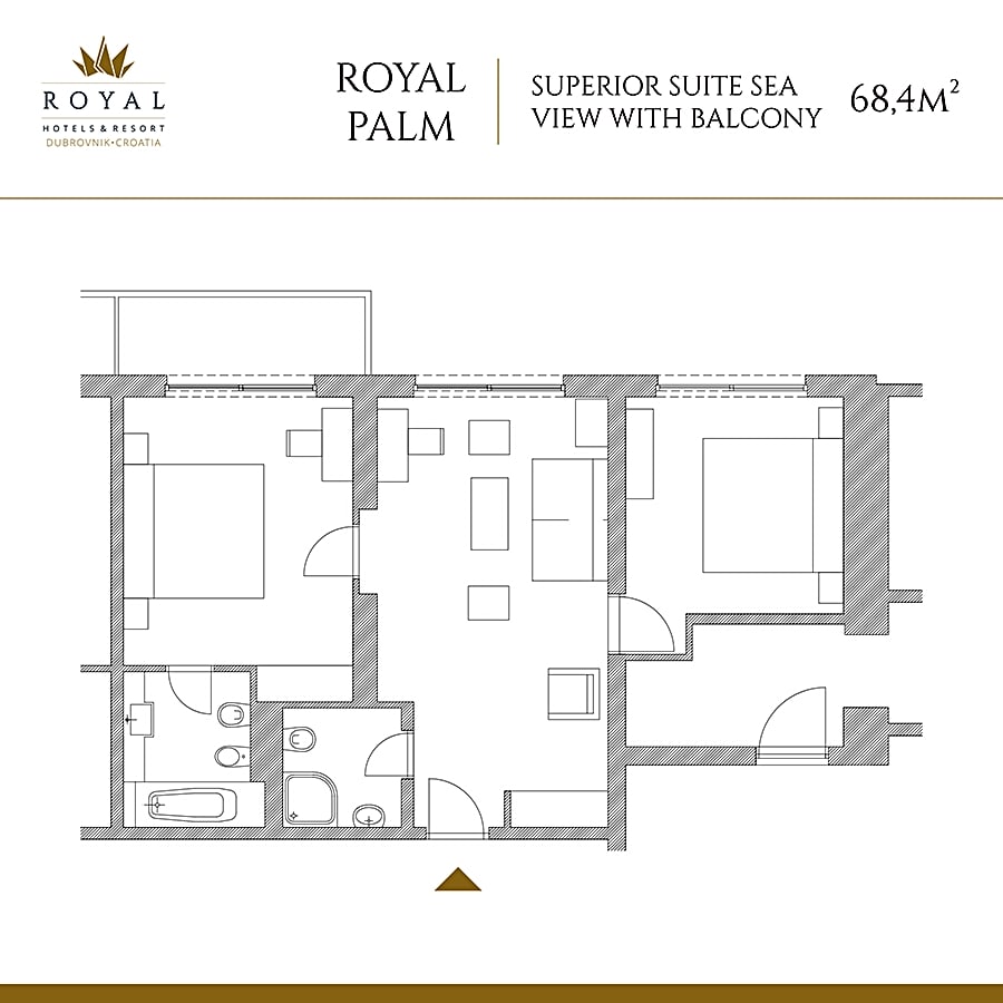 Spacious suite with 2 bedrooms and a sofa bed in the living room. Each bedroom has a king size bed. There are 2 bathrooms, one with a bathtub, the other with a shower. The suite features a flat-screen TV and a mini-bar, as well as a furnished balcony overlooking the Adriatic sea and the islands.