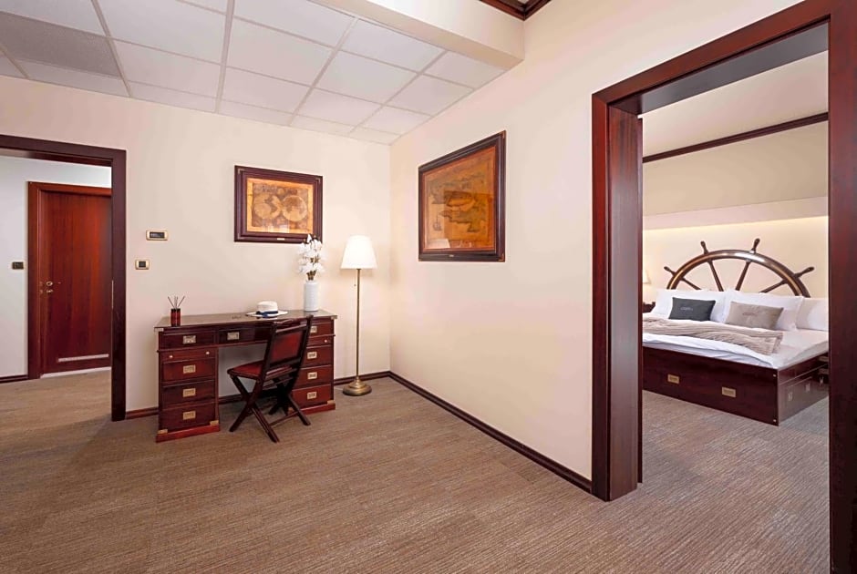 The spacious one-bedroom suite offers a comfortable retreat, featuring a separate living area and a cozy double bedroom. Thoughtfully designed, the suite includes air conditioning, a mini-bar, and a private bathroom with a walk-in shower and hairdryer. Guests can unwind on the suite’s private balcony and enjoy additional amenities, such as a wardrobe and a flat-screen TV with satellite channels, ensuring a relaxing and well-equipped stay.