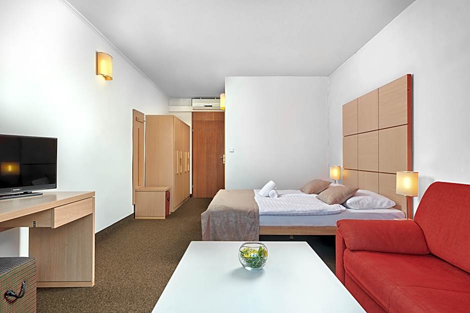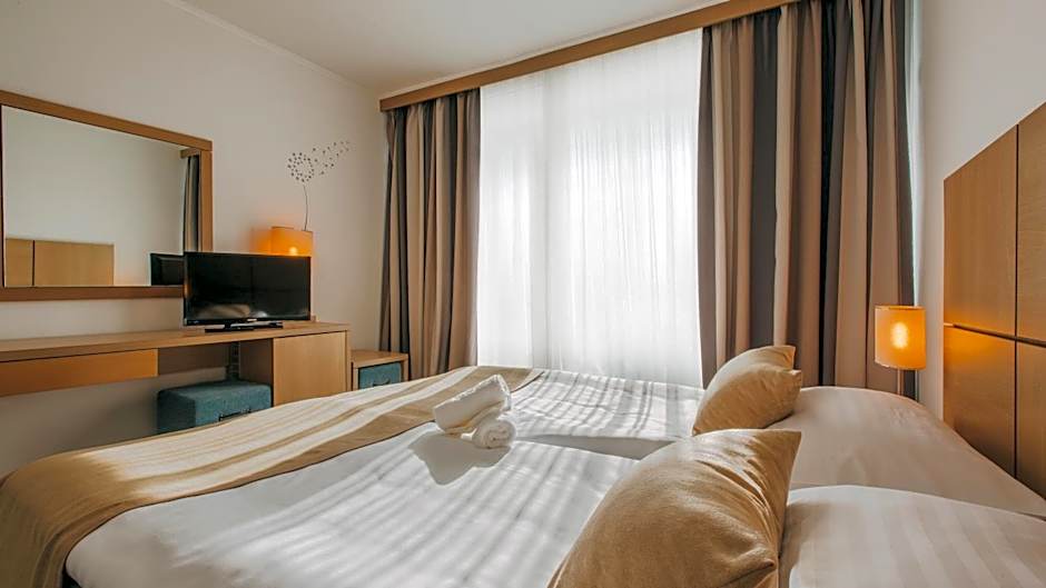 Dobra lokacija , lijep hotel. U veceru su ukljuceni sokovi, pivo i vino sto je lijepo. Lijepa terasa za dorucak I veceru. Bila je muzika jedan dan. Soba je bila ok I imala je lijepi balkon.