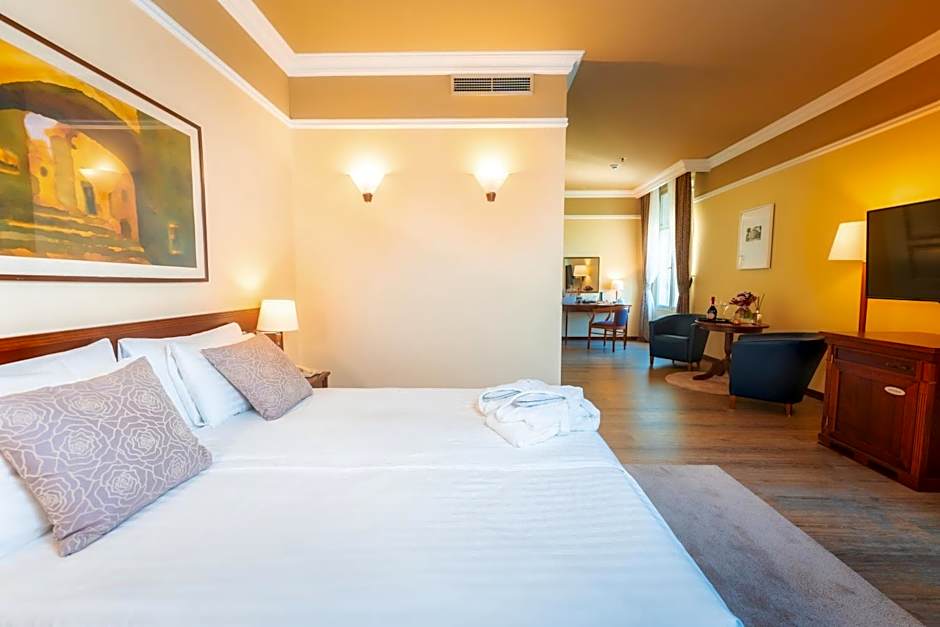 Elegant and luxurious room with air conditioning, mini-bar, satellite TV, telephone, WLAN, safety deposit box and international 220V outlets. There is a seating area and bathrobes are available.