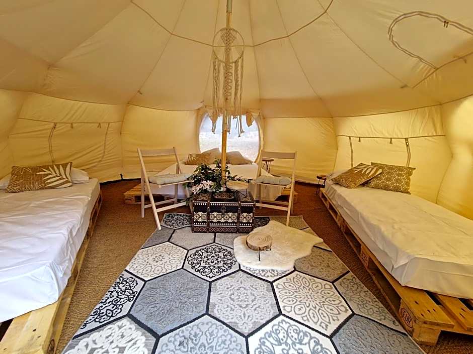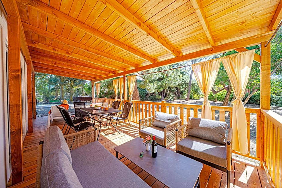 Accommodations come in several mobile home layouts—Premium, Superior, Standard, Comfort, and Deluxe—with a Tent option also available. Premium and Superior units sleep up to five adults and four children, featuring setups such as two twin beds, a queen bed, and a sofa bed; Deluxe arrangements provide two twin beds, a queen bed, and a sofa bed for up to five adults and five children.