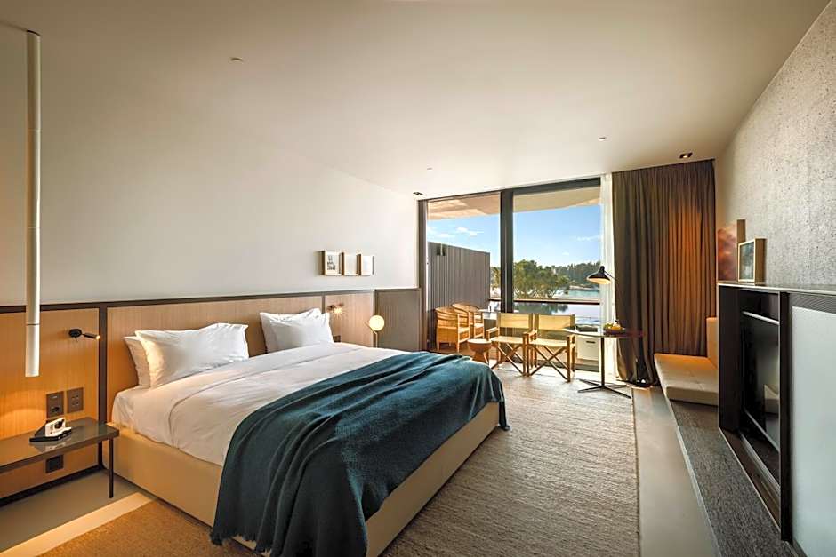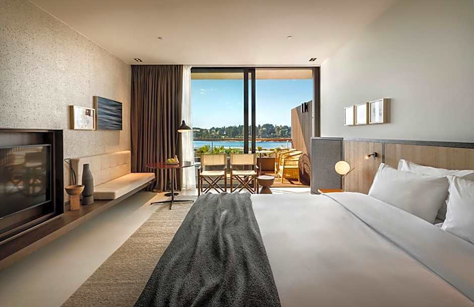 The room features a king-sized bed or two connected twin beds and is inspired by the understated pleasure of the Mediterranean felt everywhere in the hotel – in earth tones, natural materials, and Mediterranean plants on the balcony. The balcony overlooks the sea and the old town of Rovinj.