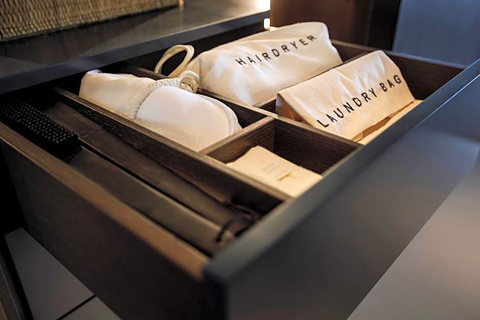 The room features a king-sized bed or two connected twin beds and is inspired by the understated pleasure of the Mediterranean felt everywhere in the hotel – in earth tones, natural materials, and Mediterranean plants on the balcony. The balcony overlooks the green parks surrounding the hotel.