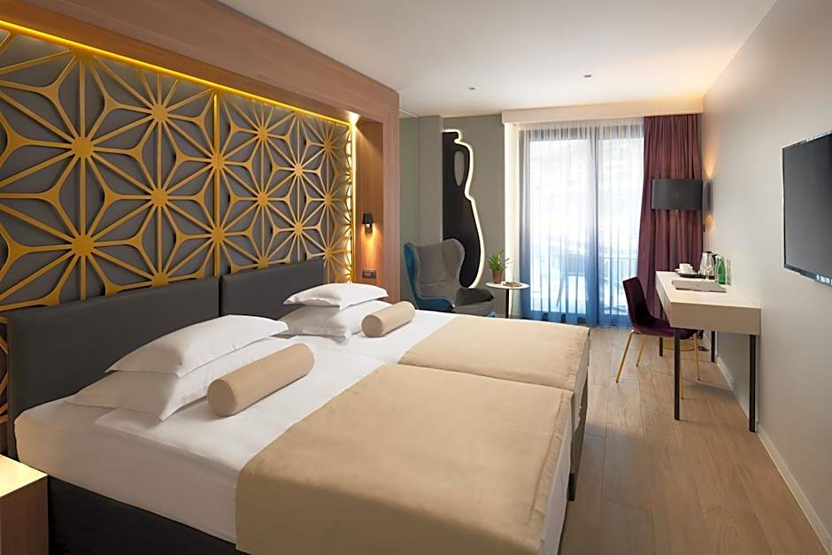 The spacious twin/double room offers air conditioning, soundproof walls, a balcony with an inner courtyard view as well as a private bathroom boasting a walk-in shower.
