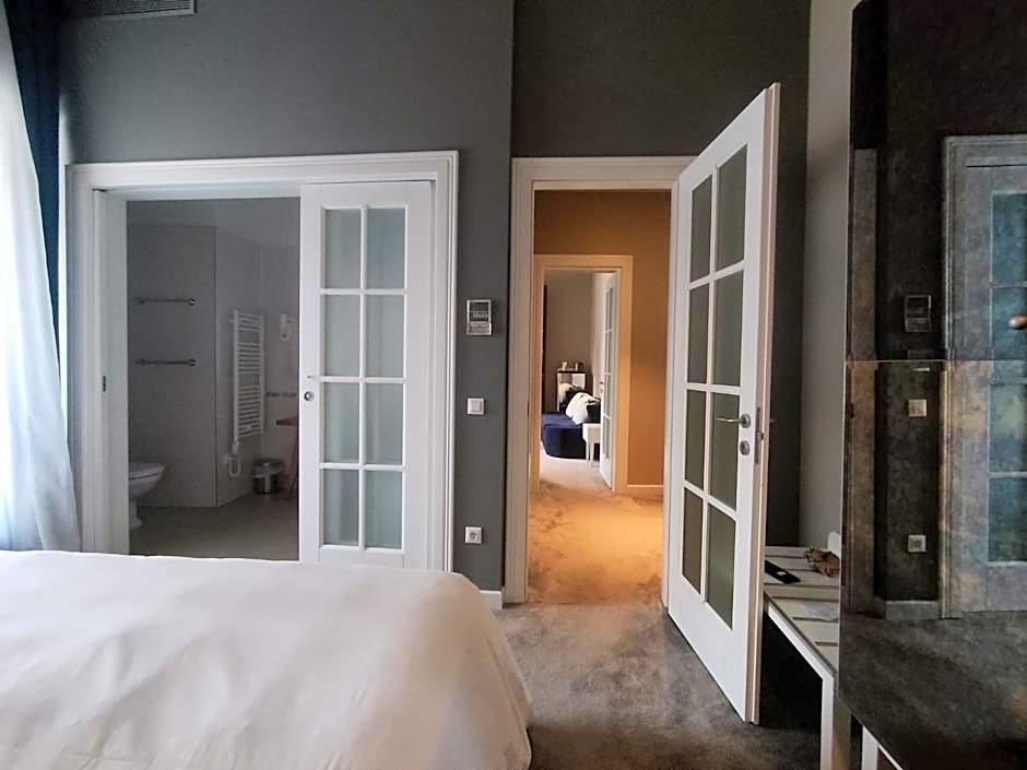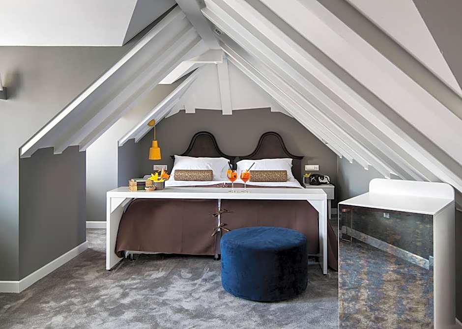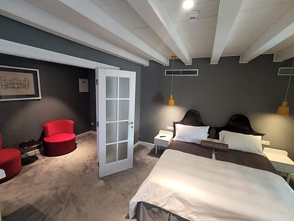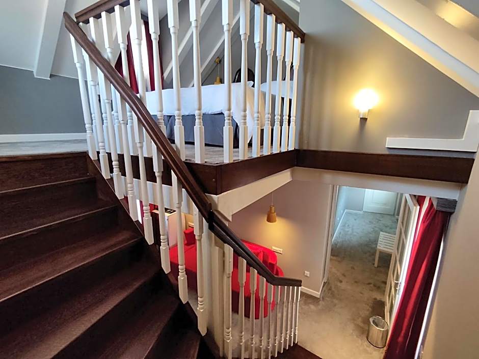 Set on the 3rd floor, this duplex suite overlooks the city. It consists of a hallway and a separate seating area with armchairs. The bottom floor is connected to the top one with a wooden staircase.