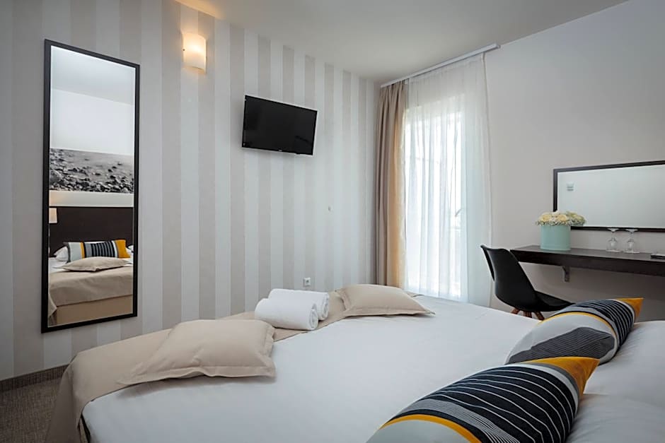 Well kept, nice hotel with a bar and a restaurant on the beach. Excellent breakfast, nice swimming pool and all the necessary facilities. Perfect location - in front of the beach, few meters to the Plava beach and 10 min walk along a nice promenade to the center of Vodica. The beach in front of the hotel is quite rocky, might not be suitable for small kids, but you can walk few meters to the right to the Plava beach with sand bottom and water park. In any case, the swimming area in front of hotel is huge and perfect for those, who do not like overcrowded places. Parking fee 10eur/day, beach towel 5/day. No charges for sunbeds for the guests of hotel.