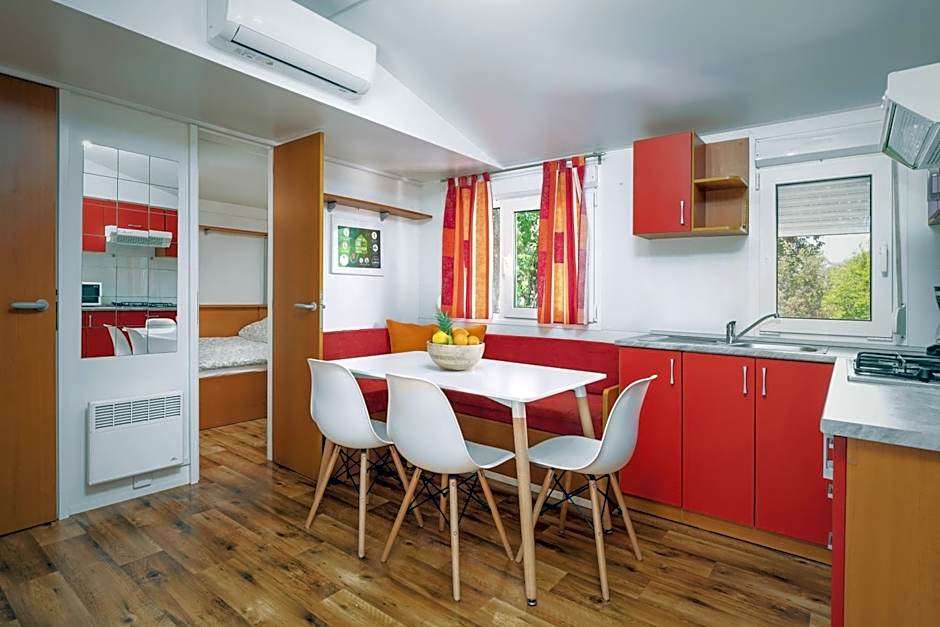 The mobile home is new and very clean. It has a large terrace with shade throughout the day and a lot of privacy considering we were in a camp. The staff is very nice, attentive and helpful.