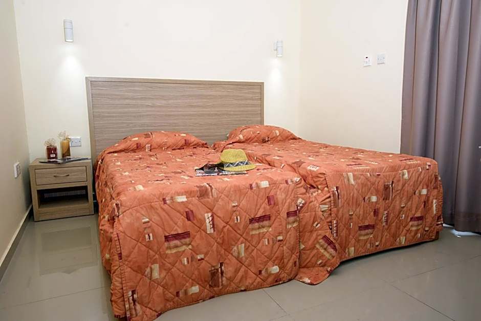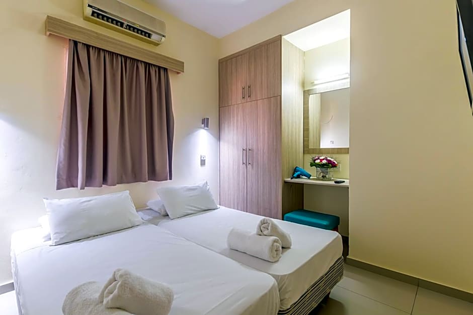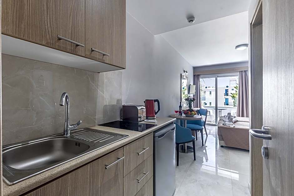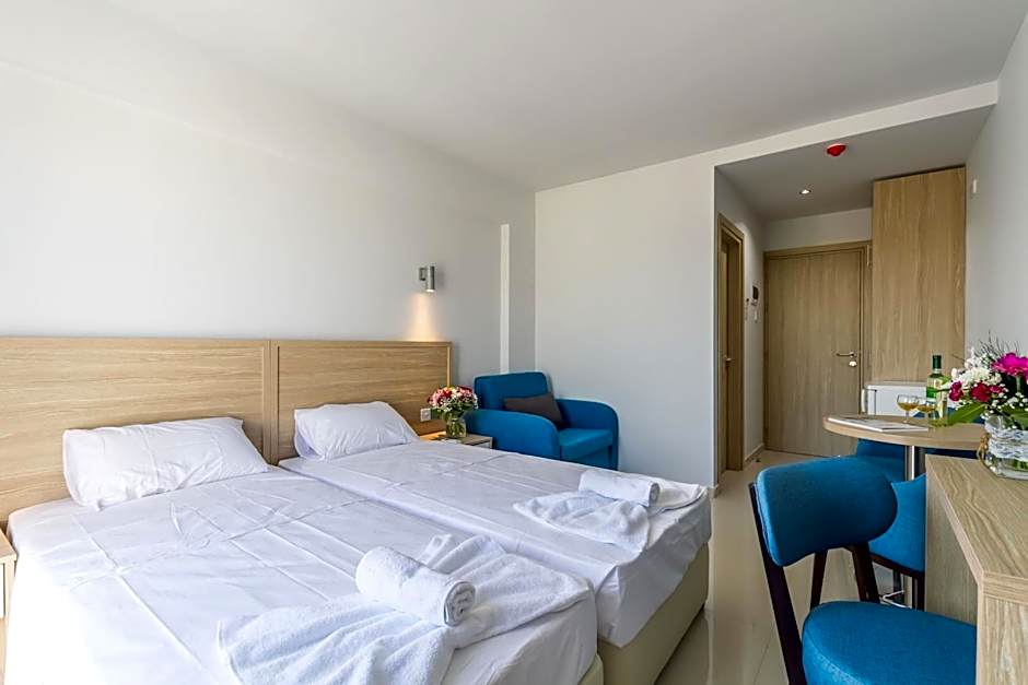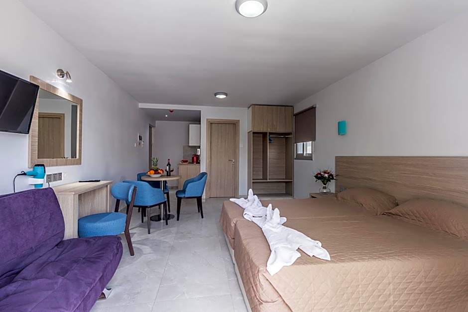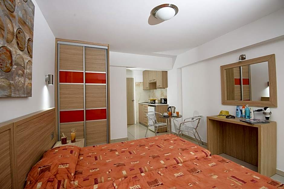 Studio Apartment, features two single beds a private bathroom with shower, seating area and a wardrobe. This room type accommodates two people and it is equipped with a kitchenette for self catering , stove top, kitchen utensils,kettle , toaster , refrigerator , dressing table , hairdryer , air condition , flat Tv screen 32" , wi-fi , Usb access point. Additionally, the room has balcony and outdoor furniture.