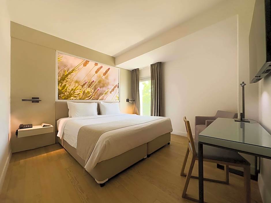 Elegant and more spacious guestroom in modern design with wooden floors, fabrics in light colors and a marbled bathroom. Free WiFi is available.