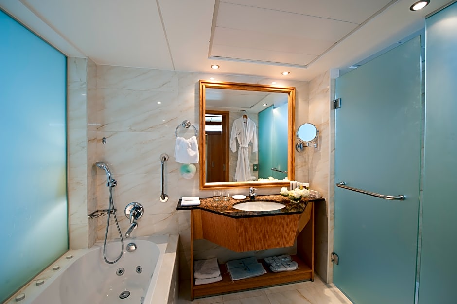 Executive One Bedroom Suite Sea View is 538 square feet and includes a king-size bed 150-183 width plus ironing set, bathrobes, and slippers.