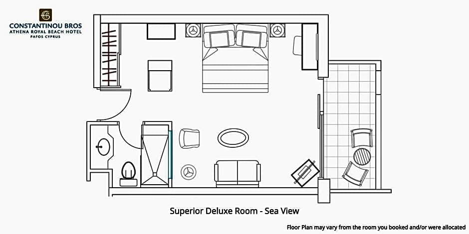 Superior Room Sea View is 237 square feet and includes a king-size bed 150-183 width plus ironing set and bathrobes.