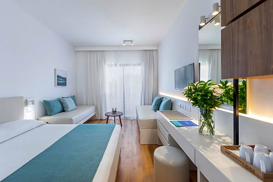 The Louis Phaethon Beach hotel offers several types of rooms including Triple, Double or Twin, and Four-Bedded rooms. All rooms have a size of 205 sqft and do not allow smoking. The Triple and Double or Twin rooms can accommodate 3 adults and 2 adults respectively, while the Four-Bedded rooms are suitable for 2 adults and 2 children. Bed options vary but can include a sofa bed and a queen or twin beds.