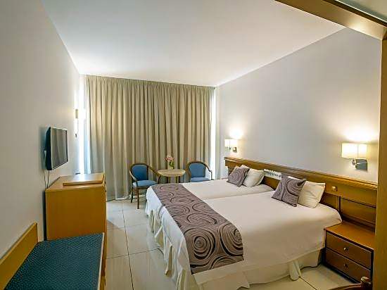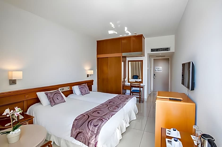 The Tsokkos Protaras Beach Hotel offers a range of room types including Deluxe Double or Twin Rooms with Inland View, Deluxe Double Rooms with Side Sea View, Double or Twin Rooms with Side Sea View, Double or Twin Rooms with Inland View, Superior Double or Twin Rooms with Side Sea View, and Superior Double or Twin Rooms with Inland View. Smoking is not allowed in any of these rooms. The rooms accommodate up to 3 adults and have either 2 twin beds or 1 double bed. The room sizes range from 269 sqft to 291 sqft.