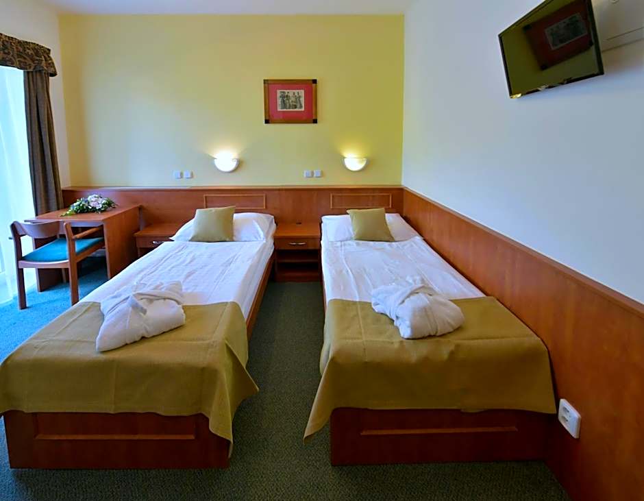 The hotel is situated in a very quiet location - but the whole place is peaceful, mostly consisting of spa buildings, hotels and restaurants. The room was big enough for 2 people, recently refurbished, had almost everything we needed, nevertheless we missed a kettle. Comfortable beds, lift in the building, free parking, a bike/ski storage room. This hotel has no reception desk - ÿou have to check in/out in the largest hotel of the resort "Novy dum", where you can also order spa procedures or swimming pool entry. Buffet meals are available in one big central restaurant/canteen, a lot of things to choose from and they are really tasty. Wonderful nature in the surroundings, lots of sights in the area either on the Czech as well as Polish territories.