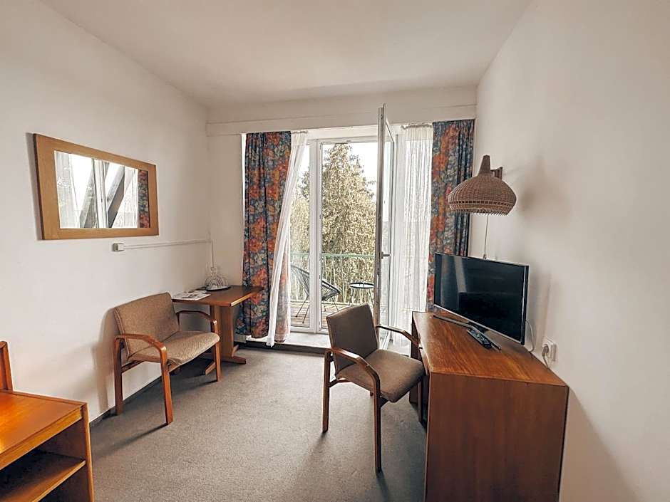 The single room offers a seating area, a wardrobe, a balcony with garden views as well as a private bathroom featuring a shower. The unit offers 1 bed.