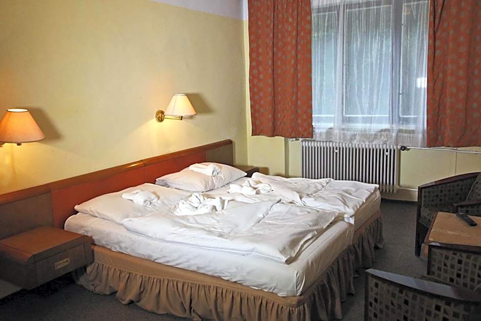 The hotel possesses its own retro charm, which I ended up quite taken with. The entire establishment was impeccably clean. The room where I was accommodated was spacious, sufficiently equipped, and I particularly appreciated the balcony with seating, providing a view of the trees and the Medlov pond. The staff were exceedingly accommodating and helpful.