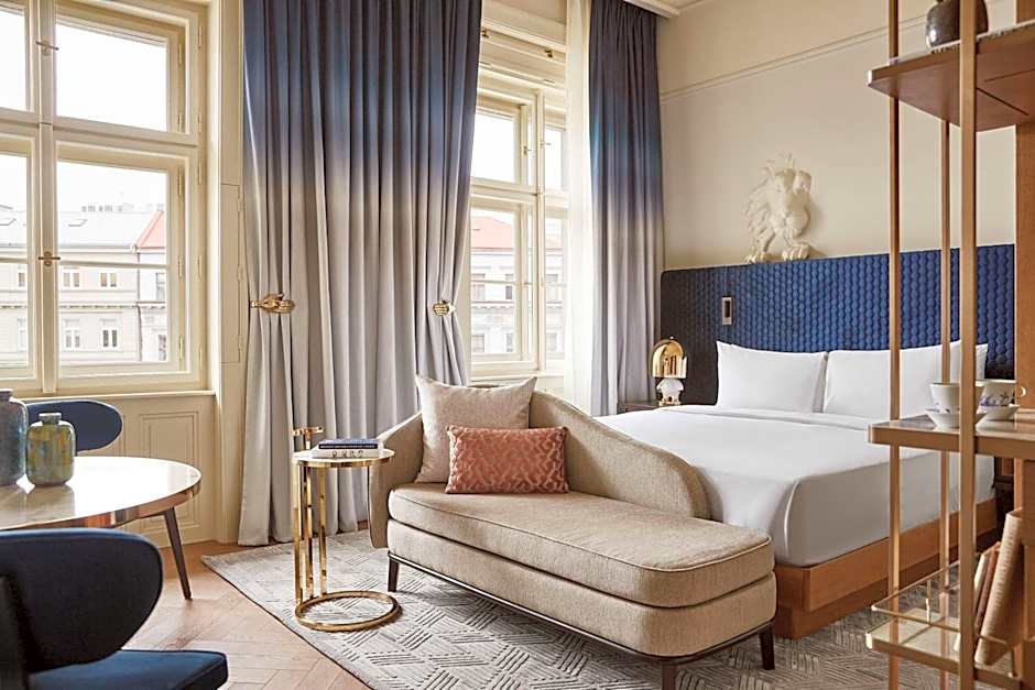 Enjoy our elegant, contemporary design Deluxe King bedroom with big, bright windows overlooking the charming streets in the heart of Prague. Lounge on the chaise-longue and savor the new and precisely detailed, art deco-inspired rooms with hardwood floors or soft carpet. The private bathroom has a shower and luxury Byredo toiletries. The room amenities include a complimentary mini-bar with select local snacks and beverages and a flat-screen TV with a casting option.