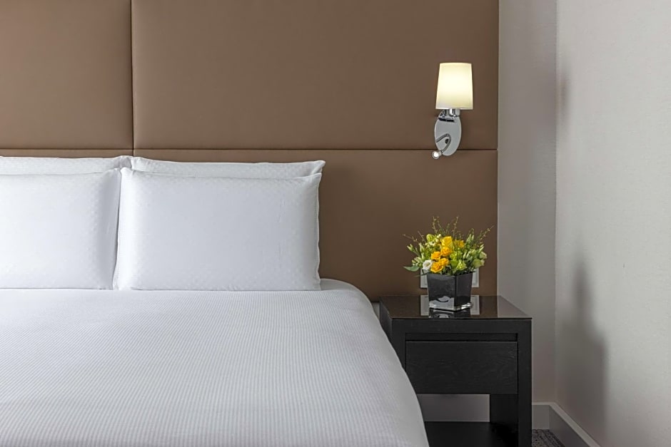 Set on a higher floor of the hotel, the Queen Executive Room showcases a sophisticated style with Art Deco details, including a headboard, reading lamp, and elegant bedside lighting. Guests enjoy exclusive Executive Lounge access which offers free Wi-Fi, drinks, and snacks throughout the day, as well as complimentary water, bathrobes, and slippers. The room is equipped with a hardwood desk with USB sockets, a 55-inch TV, and a mini-refrigerator. The marble bathroom offers a walk-in shower or bathtub and complimentary toiletries. Please note that extra beds are not possible in this room.