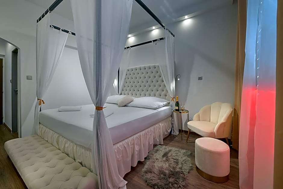 The Hotel Aura Design & Garden Pool offers a variety of rooms. These include Deluxe Double or Twin Rooms with Pool Access that can accommodate 2 adults and 1 child, Romantic Double Rooms with Pool Access for 2 adults only, Standard Double or Twin Rooms for 2 adults, Triple Rooms with Pool Access for 3 adults, Elegant Double Rooms with Pool Access for 2 adults, Wellness Rooms with Private Jacuzzis for 2 adults, King Rooms with Pool Access for 2 adults, Wellness Rooms with Private Saunas and Jacuzzis for 2 adults, and Junior Suites with Pool Access for 4 adults. Smoking is not allowed in any of the rooms. Room sizes range from 161 sqft to 323 sqft.