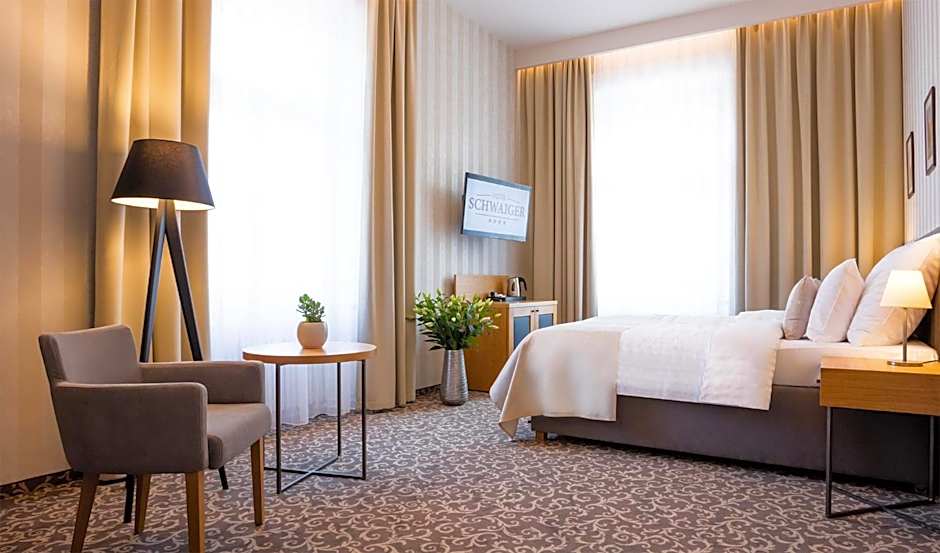 Hotel Schwaiger offers a variety of room options including Double or Twin Rooms, Business Double or Twin Rooms, Garden Junior Suites with Private Entrance, and Junior Suites. All rooms do not allow smoking. Double or Twin rooms and Business Double or Twin rooms have a room size of 215 sqft and 291 sqft respectively with accommodations for 2 adults and 1 child. The Garden Junior Suite and Junior Suite are both larger at 377 sqft and 323 sqft respectively and can accommodate 3 adults and 2 children.