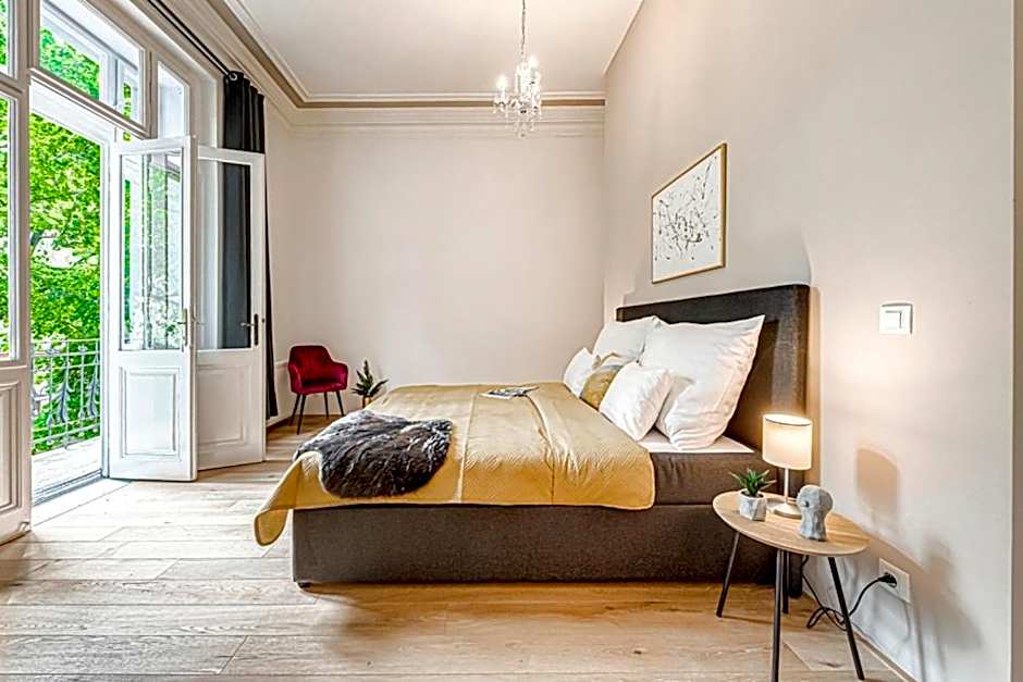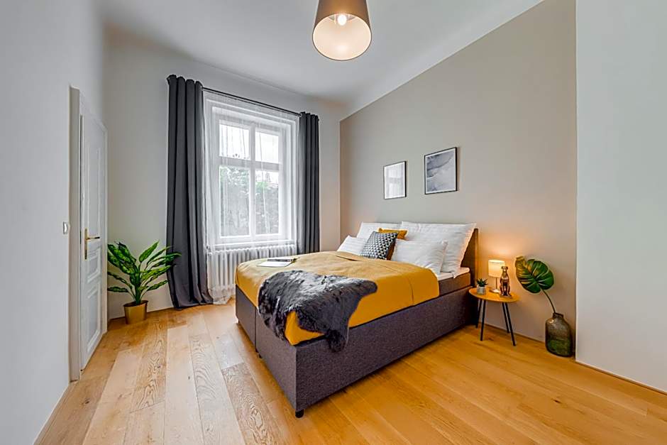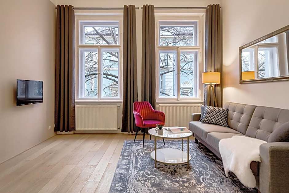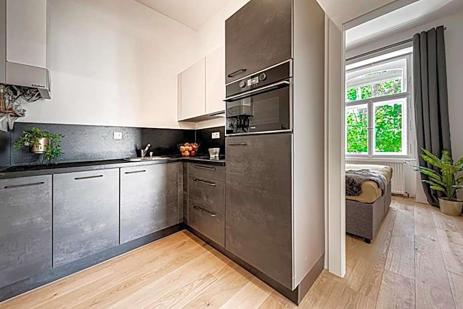 above all, we appreciated the availability of the staff to help and find solutions. At our initial apartment work on the facade was being done and window was covered with a foil so no view no fresh air. We asked for a solution and within an hour were given another apartment, cleaning lady was also very helpful in that. perfect customer care! the 2nd apartment had everything in it that we needed, view on the park outside, nice wooden floor, a lovely old apartment refurbished ... all good. Tramway to the city center is just few minutes walk from the flat, metro line B is a few steps further (5min walk). BILLA supermarket is in walking distance. Good restaurants and bars are in walking distance - a quick google maps search is enough to identify them.