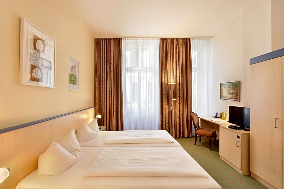 Location is good, there is a U- and tram stop very near. Easy to use public transport. I liked the room, we got a little bigger room with a nice wiew/ window outside. The room was comfortable and spacious. Room was clean. There is a renervation going on so public premises were littlr outdated but it didn’t disturbe me. There was a coffeemacine, it was nice. We didnt take breakfast.