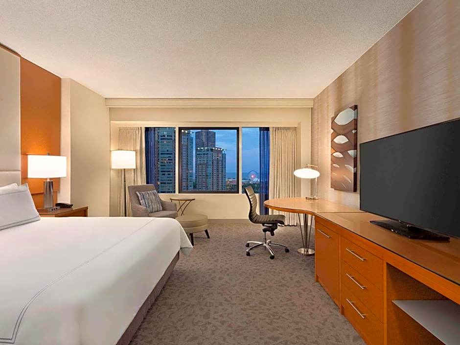 Poor shower design -- cannot set temp without getting oneself or the bathroom floor wet. Outrageous cost of parking (valet or self) -- we used self-park next door (345 E. Wacker) for less than half the price. Outrageous cost of breakfast (did not use). Bar closes at midnight (unheard of in our experience in a major hotel in a prime location in a major city).