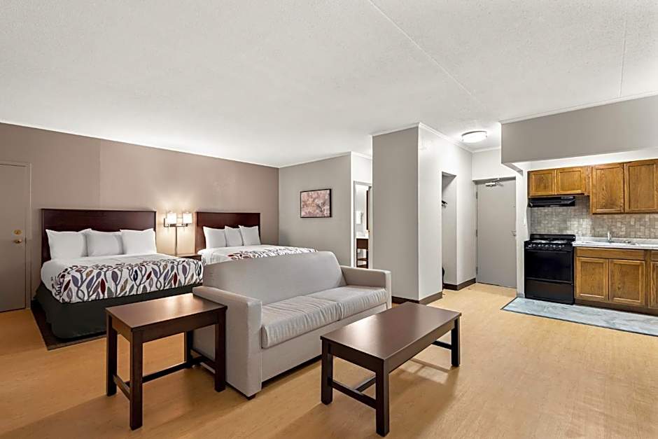 Es sind mehrere Zimmerkonfigurationen aufgeführt, darunter Zimmer mit Kitchenette und verschiedene Suiten. Optionen umfassen Room, Kitchenette; Suite mit zwei Queen-Betten und Kitchenette; King-Suite mit Kitchenette; sowie weitere Kombinationen. Nichtraucheroptionen sind verfügbar, sodass für unterschiedliche Vorlieben passende Angebote vorhanden sind.